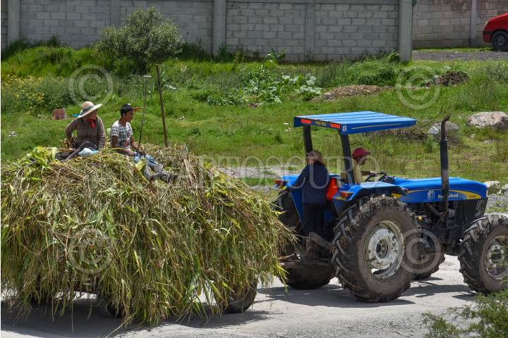 Un campesino vuelve después de un día de trabajo montado en un remolque jalado por un tractor.