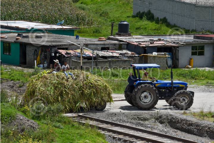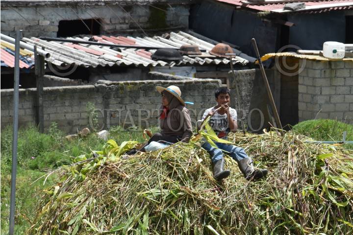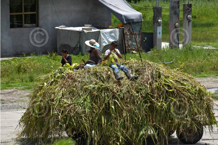 Una familia termina sus labores en el campo y aprovecha para comerse una caña en lo alto de las milpas que trasladan en un tractor.