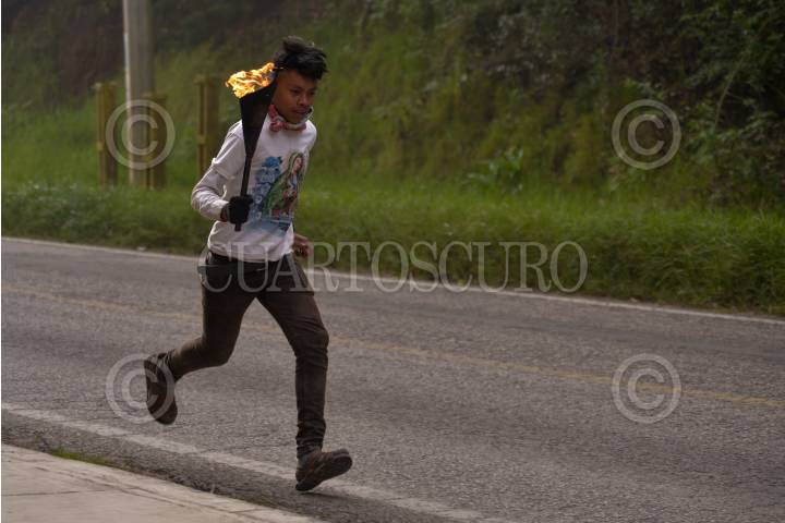 SAN JUAN CHAMULA, CHIAPAS, 02DICIEMBRE2023.- El club Tepeyac de antorchistas guadalupanos salió desde el Paraje de las Ventanas como cada año desde 1984, año en que empezó su peregrinación. Decenas de jóvenes tomaron camino rumbo a Oaxaca, para regresar con su familiares en unos días con la antorcha encendida, conmemorando a la virgen de Guadalupe en su celebración anual. FOTO: ISABEL MATEOS /CUARTOSCURO.COM