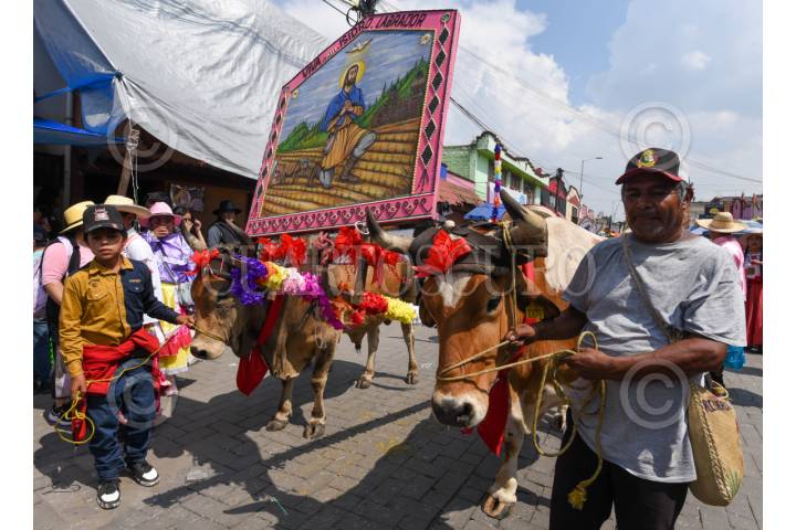 METEPEC, ESTADO DE MÉXICO, 10JUNIO2025.- Un hombre participa en el Paseo de la Agricultura en Metepec con su yunta de bueyes adornada con un retablo de semillas en honor a San Isidro Labrador Santo Patrono del municipio, con atuendos de arrieros, tlacuaneras, jinetes, monstruos, políticos, recorren al ritmo de la música las principales calles de la cabecera municipal, ofreciendo algún dulce, pan o algún otro regalo a los miles de asistentes. FOTO: CRISANTA ESPINOSA AGUILAR /CUARTOSCURO.COM