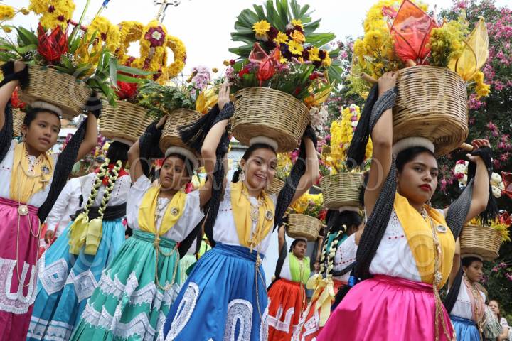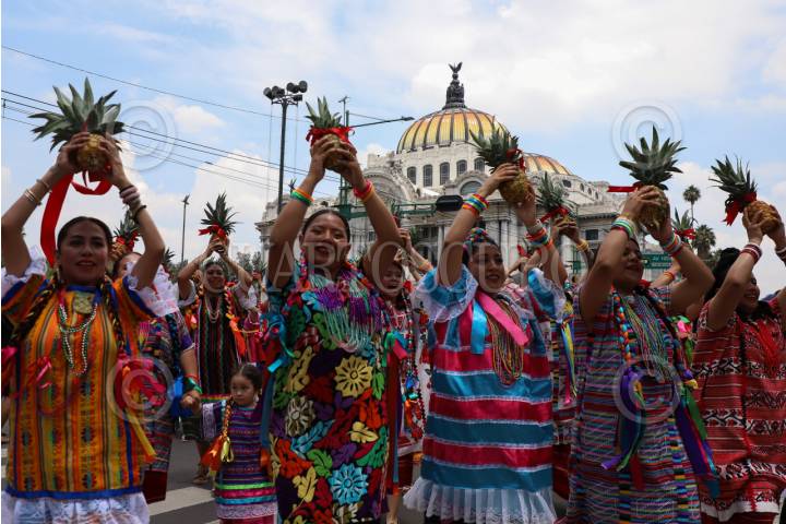 CIUDAD DE MÉXICO, 24AGOSTO2025.- El baile de la Flor de Piña avanzó frente al Palacio de Bellas Artes por la calenda como parte de las celebracion de la Feria de los Pueblos Originarios. FOTO: DANIEL AUGUSTO/ CUARTOSCURO.COM