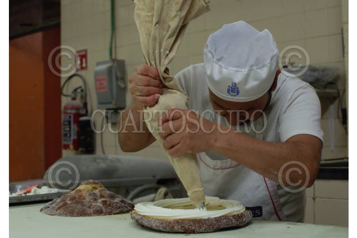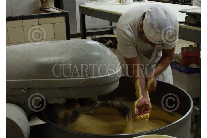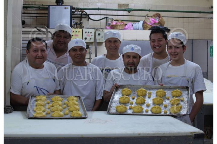 MÉXICO, D.F., 01NOVIEMBRE2014.- La panadería La Vasconia, fundada en 1870, es considerada la más antigua de la ciudad. El equipo de panaderos, comandado por el maestro Dionisio quien se dedica al oficio desde hace 30 años, trabaja desde ayer y hasta hoy en la madrugada para sacar los pedidos de pan de muerto solicitados por la centena de clientes en estas fechas de Día de Muertos. A una temperatura de 210 grados, centígrados las decenas de charolas de pan de muerto se hornear en promedio de 30 minutos. Levadura, esencia de azahar, mantequilla, manteca, huevos, harina, leche y azúcar son los ingredientes de esta tradicional receta. El proceso de elaboración del pan es casi artesanal, excepto por la utilización de la batidora y revolvedora. FOTO: MARÍA JOSÉ MARTÍNEZ /CUARTOSCURO.COM
