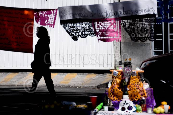 Una mujer pasa detrás de la ofrenda de Sexoservidoras que fue colocada en la Av. Puente de Alvarado.