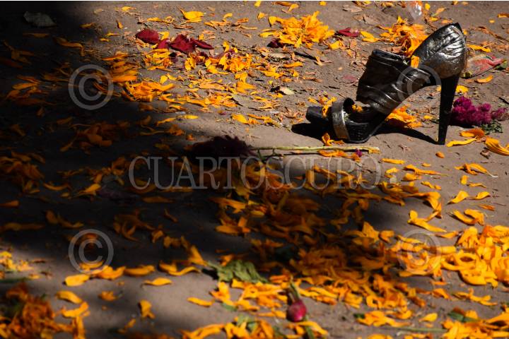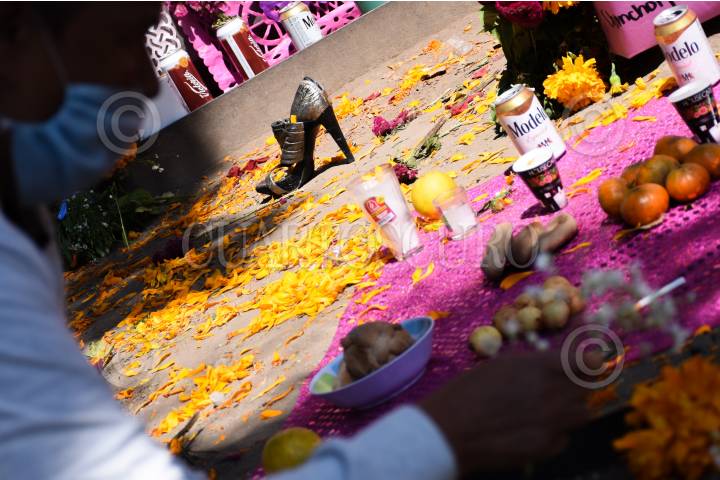 Un tacón que perteneció a una sexoservidora es colocado en la ofrenda.