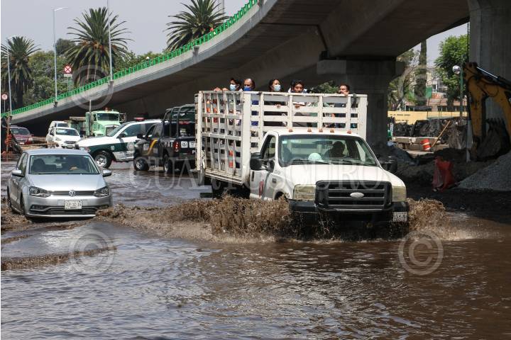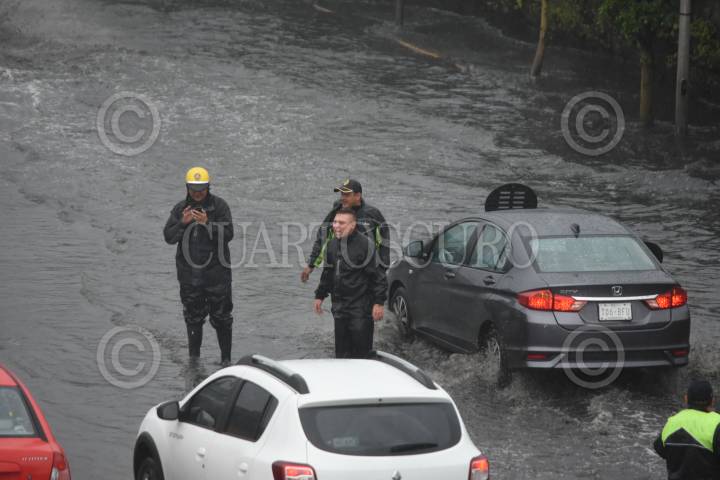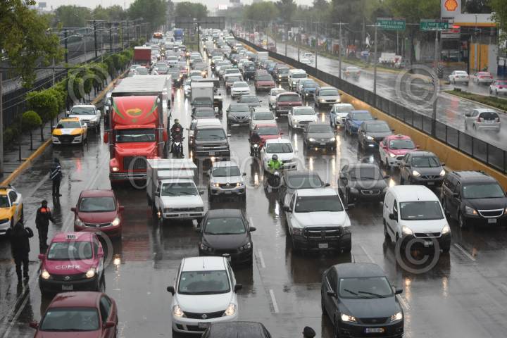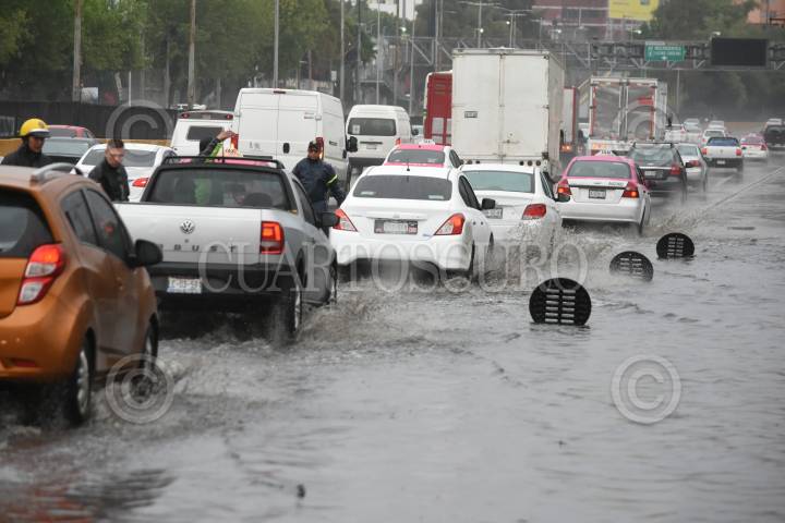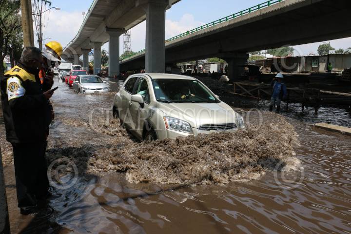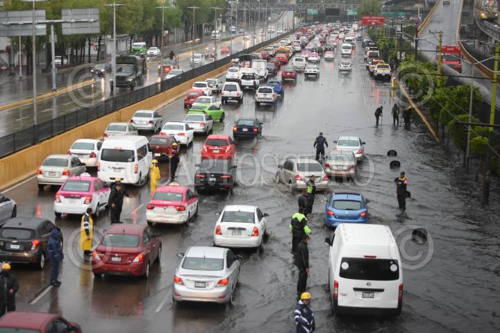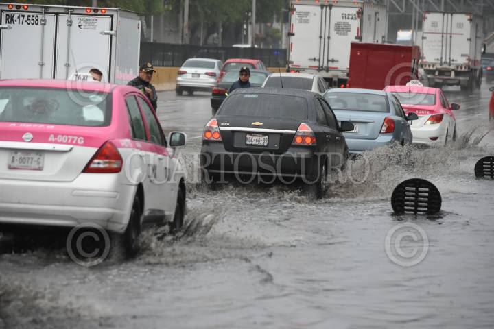 Las lluvias de la noche y de esta mañana provocaron un severo encharcamiento en Circuito Interior, a la altura del Aeropuerto Internacional de la Ciudad de México.