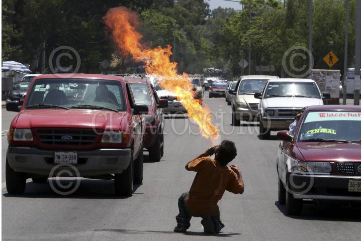 XALAPA, VERACRUZ, 19ABRIL2013.- Por la ola de violencia que impera en el estado de Michoacán niños y jóvenes de éste estado de entre los 10 y 15 años de edad emigraron a esta capital para ganarse la vida en las calles limpiando parabrisas mientras que otros más atrevidos se la ven con el fuego. FOTO: TONA NAVARRO /CUARTOSCURO.COM