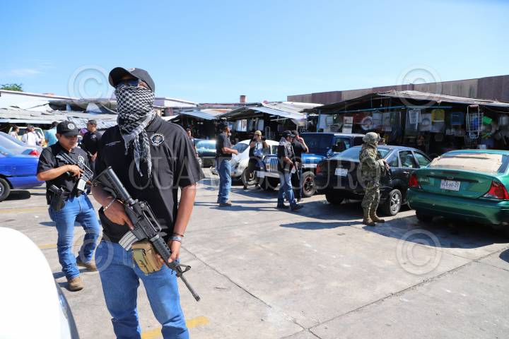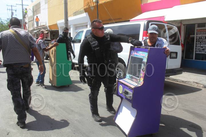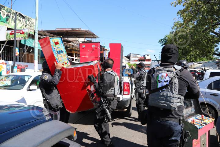 ACAPULCO, GUERRERO, 23ABRIL2019.- En un fuerte operativo la Marina, la Fiscalía General del Estado, la Policía Estatal y la Policía Ministerial decomisaron máquinas tragamonedas en el Mercado Central en Acapulco y revisaron vehículos con reporte de robo. El fiscal Jorge Zuriel Santos Barrila encabezó el operativo en el que los uniformados estuvieron fuertemente armados y explicó que se trata de una acción interinstitucional para detectar anomalías en el mercado. Los clientes y comerciantes se asombraron por la excesiva presencia de corporaciones policíacas y se observó que algunos locatarios se apresuraron a guardar máquinas para evitar el decomiso. FOTO: CARLOS ALBERTO CARBAJAL /CUARTOSCURO.COM