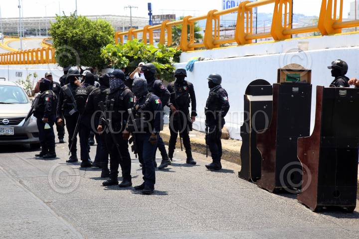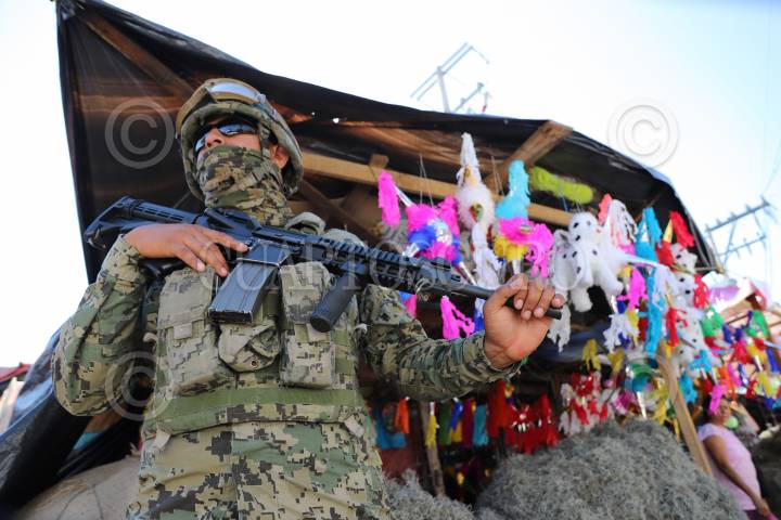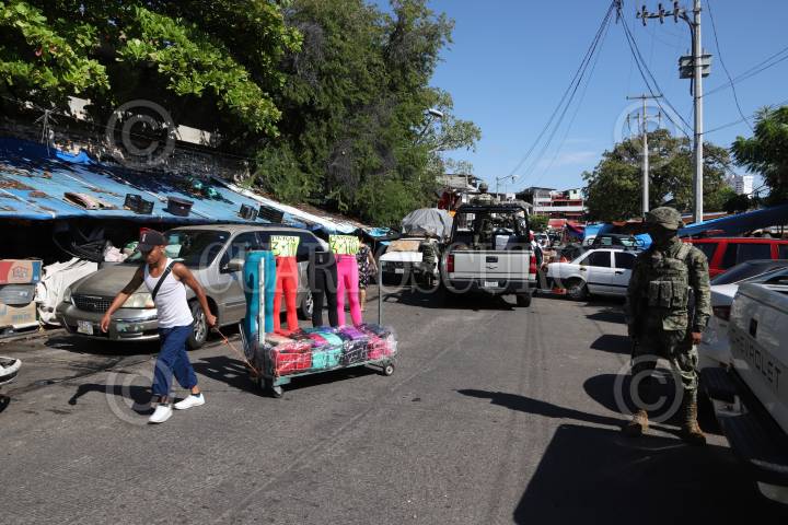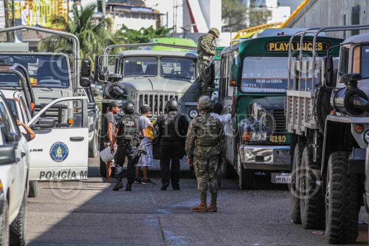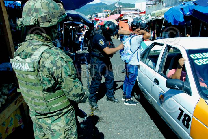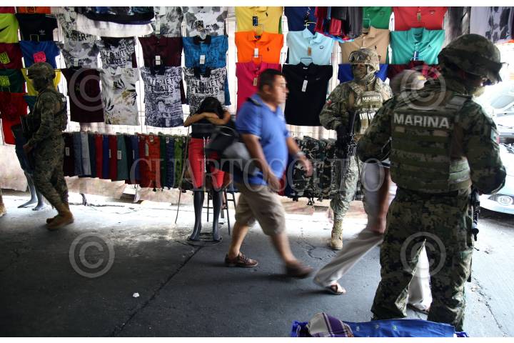 ACAPULCO, GUERRERO, 04DICIEMBRE2018.- Elementos de la Secretaría de Marina, Policía Federal, Gendarmería, Policía Estatal, Agente Ministeriales y Policías Municipales realizaron varios operativos en el Mercado Central de Acapulco y en su calles aledañas, como resultado de estas acciones se detuvo a cinco hombres, uno por administrar máquinas traga monedas, locatarios denuncian que estos aparatos sirven como fuente de financiamiento del grupo criminal Cartel Independiente de Acapulco, además de que a ellos les cobran "cuota". Elementos de la Marina obstaculizaron la labor periodística de los medios que dieron seguimiento al despliegue, tal es caso del fotoperiodista Bernandino Hernández. FOTO: BERNANDINO HERNÁNDEZ /CUARTOSCURO.COM