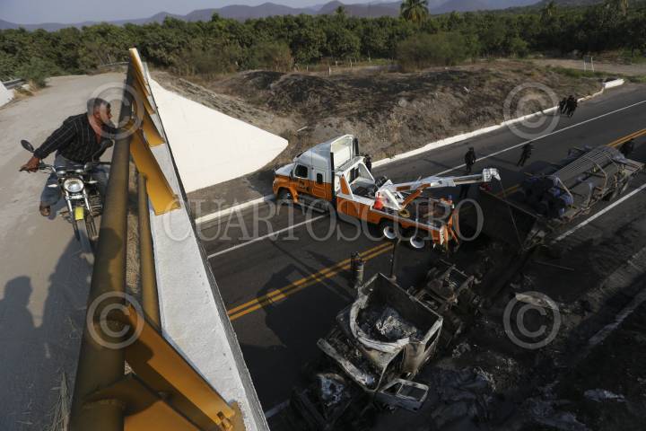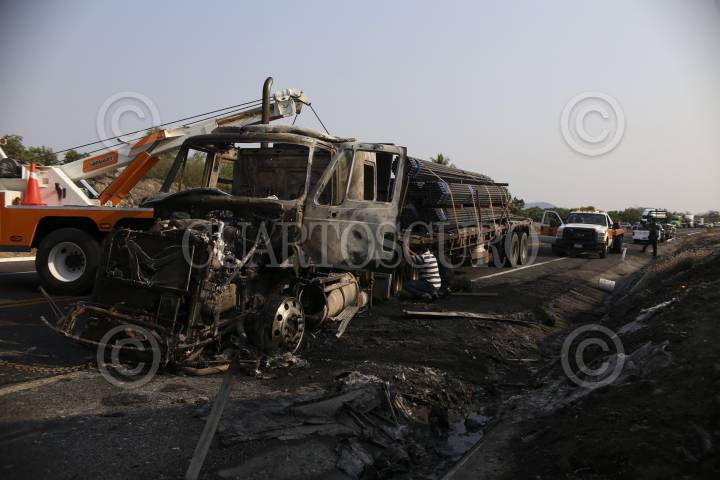 MÚGICA, MICHOACÁN, 18MAYO2017.- Se registró un incendió de un tráiler materialista por parte de supuestos integrantes del crimen organizado, esto en respuesta a la detención de 22 personas de este municipio, las cuales estarían bajo las órdenes de Ignacio Rentería, alías el Cenizo, líder del Cartel de los Caballeros Templarios. FOTO: ARMANDO SOLÍS /CUARTOSCURO.COM