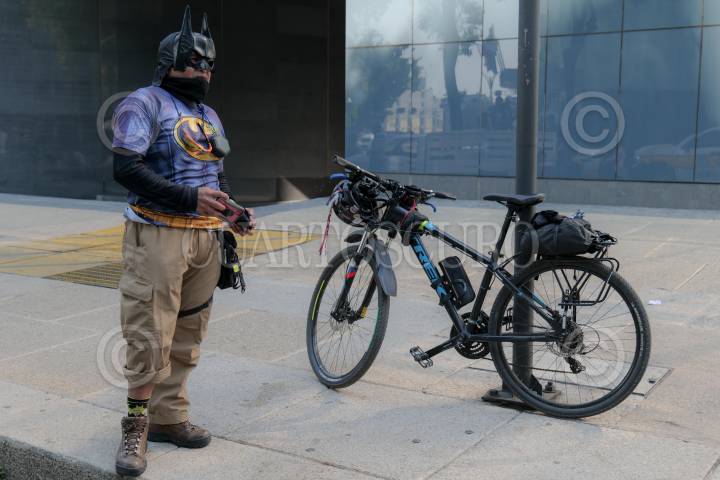 CIUDAD DE MÉXICO, 08JUNIO2024.- Un ciclista vestido de "Batman" observa el recorrido de la Gran Rodada que partió del Monumento a la Revolución al Parque Bicentenario en Azcapotzalco, en conmemoración del Dia Mundial de la Bicicleta 2024. FOTO:ALICE MORITZ/CUARTOSCURO.COM
