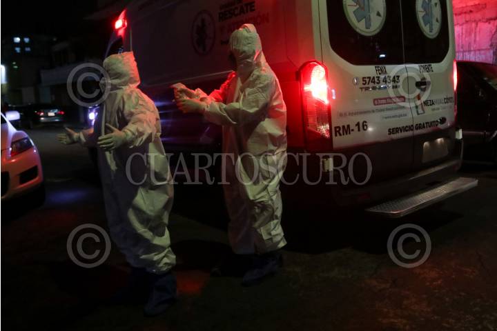 Los paramédicos Emma Velázquez y José Enríquez Navarro se sanitizaron después de entrar a una casa de un paciente con Covid-19