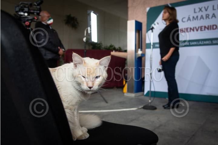 Un gato que habita en las instalaciones de la Cámara de Diputados permanece en una silla mientras se llevan a cabo las entrevistas a legisladores del PRI durante proceso de credencialización para la LXV Legislatura del Congreso de la Unión.