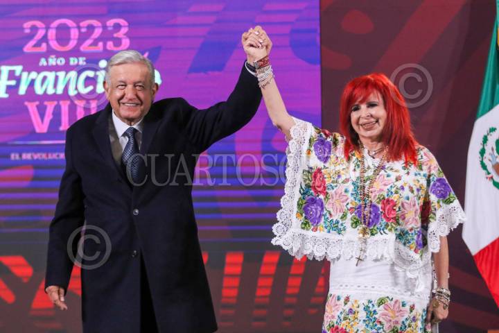Andrés Manuel López Obrador, Presidente de México, y Layda Sansores, gobernadora de Campeche, durante la mañanera en la que dieron detalles del Tramo 2 del Tren Maya