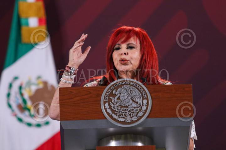 María Luisa Albores González, secretaria de Medio Ambiente y Recursos Naturales (Semarnat), durante la mañanera en la que se dieron detalles del Tramo 2 del Tren Maya.