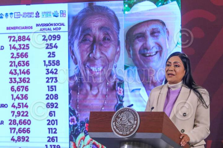 Ariadna Montiel Reyes, secretaria de Bienestar, durante la mañanera en qué se dieron detalles del Tramo 2 del Tren Maya.