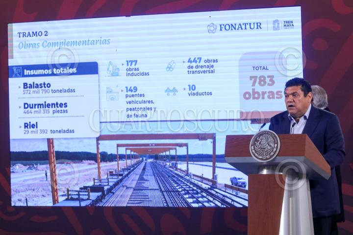 Javier May Rodríguez, director general del Fondo Nacional de Fomento al Turismo (Fonatur), durante la mañanera en la que se dieron detalles del Tramo 2 del Tren Maya.