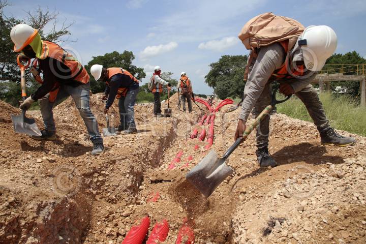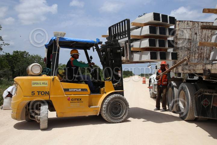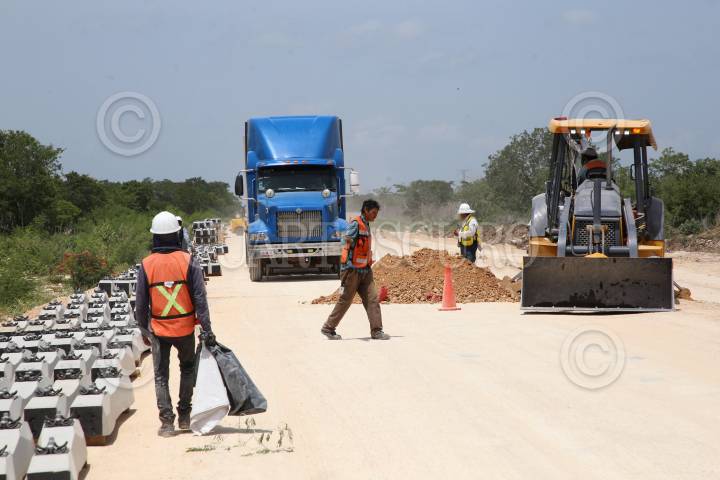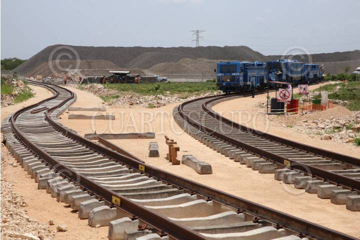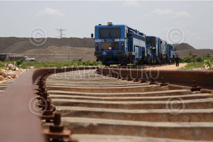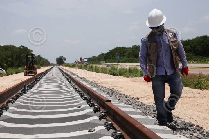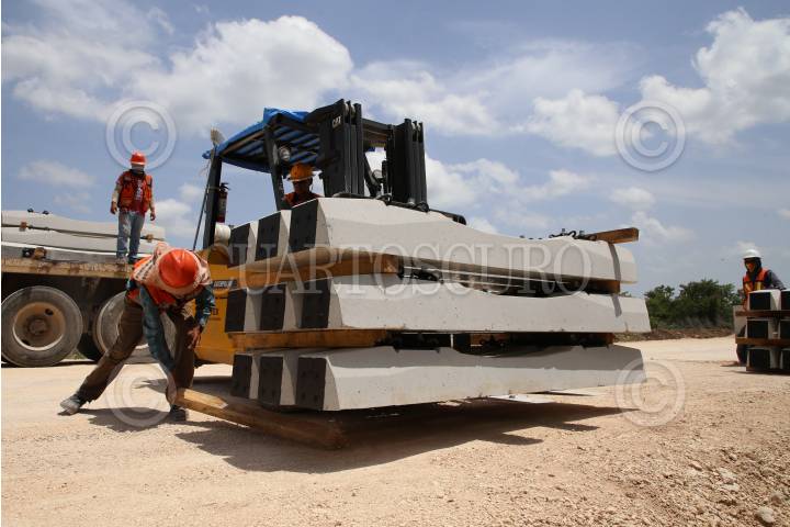 Trabajadores realizan acomodo y armado de las vías férreas en el Tramo 3 del Tren Maya, en el los municipios de Calkiní-Izamala y Chocholá.
