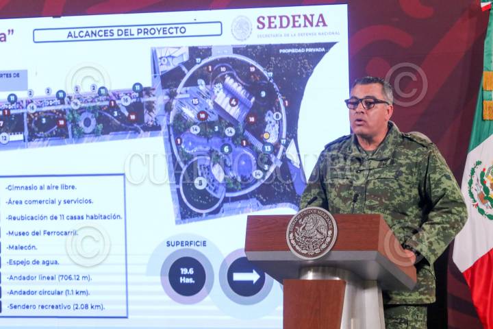 Blas Andrés Núñez Jordán, jefe del Centro Coordinador de Operaciones (CCO) del Tren Maya, adscrito a la Dirección General de Ingenieros de la Secretaría de la Defensa Nacional (Sedena), durante la mañanera en la que se dieron detalles del Tramo 3 del Tren Maya.