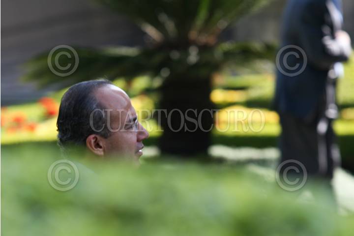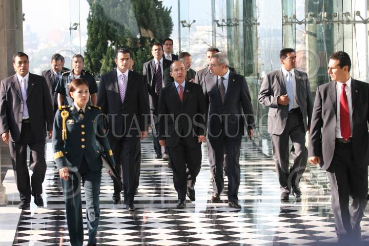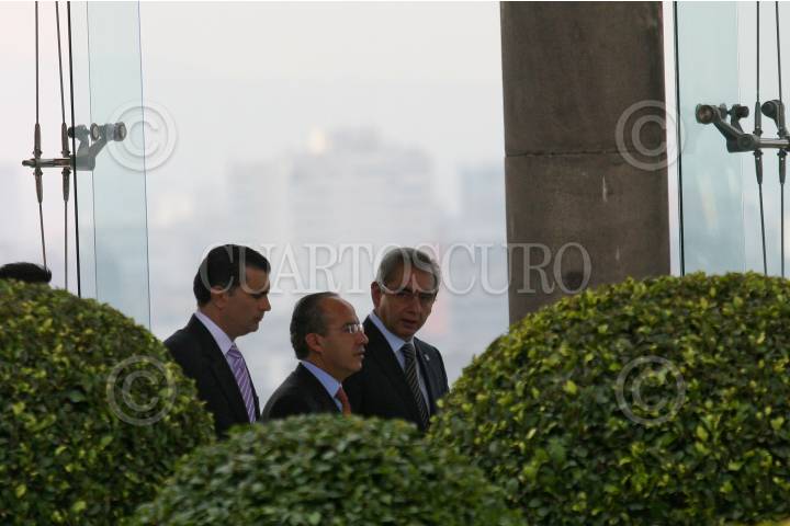 MÉXICO D.F., 12AGOSTO2009.- Felipe Calderón Hinojosa, Presidente de México, acompañado de Salvador Vega Casillas, Secretario de la Función Pública, Alonzo Lujambio, titular de la SEP, así como su seguridad a su llegada a la ceremonia en la cual fueron entregados los premios del “Concurso de Dibujo Adiós a las Trampas” esto en el Salón Alcazar del Castillo de Chapultepec. FOTO: GUILLERMO PEREA /CUARTOSCURO.COM