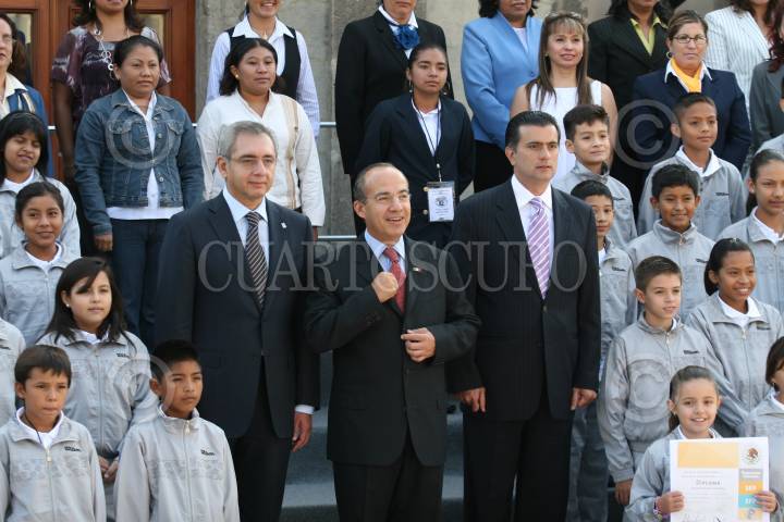 MÉXICO D.F., 12AGOSTO2009.- Felipe Calderón Hinojosa, Presidente de México, acompañado de Salvador Vega Casillas, Secretario de la Función Pública, Alonzo Lujambio, titular de la SEP, encabezo la ceremonia en la cual fueron entregados los premios del “Concurso de Dibujo Adiós a las Trampas” esto en el Salón Alcazar del Castillo de Chapultepec. FOTO: GUILLERMO PEREA /CUARTOSCURO.COM