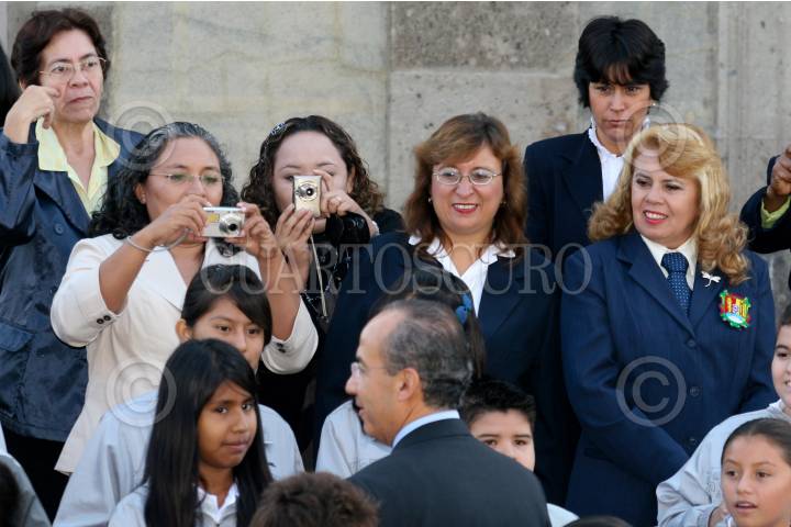 MÉXICO D.F., 12AGOSTO2009.- Felipe Calderón Hinojosa, Presidente de México, es fotografiado y observado por las maestras asistentes a la ceremonia en la cual fueron entregados los premios del “Concurso de Dibujo Adiós a las Trampas” saludo a los estudiantes y maestros después de la foto oficial, esto en el Salón Alcazar del Castillo de Chapultepec. FOTO: GUILLERMO PEREA /CUARTOSCURO.COM