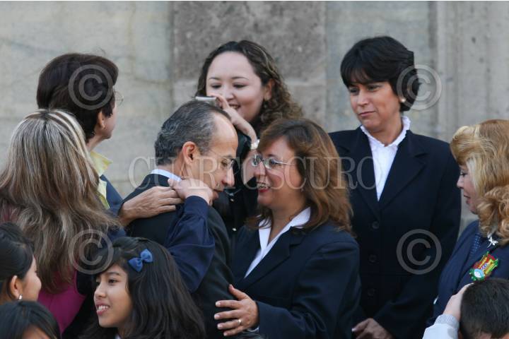 MÉXICO D.F., 12AGOSTO2009.- Felipe Calderón Hinojosa, Presidente de México, es saludado por las maestras asistentes a la ceremonia en la cual fueron entregados los premios del “Concurso de Dibujo Adiós a las Trampas” saludo a los estudiantes y maestros después de la foto oficial, esto en el Salón Alcazar del Castillo de Chapultepec. FOTO: GUILLERMO PEREA /CUARTOSCURO.COM