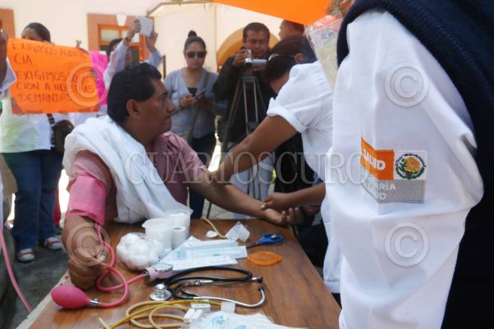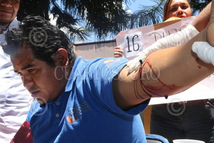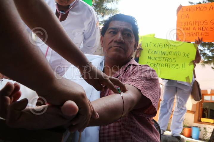 OAXACA, OAXACA, 26JUNIO2015.- Cuatro trabajadores de la Secretaría de Salud se desangraron este viernes para exigir la recontratación de 28 doctores, enfermeras, psicólogos y trabajadores administrativos quienes culminan contrato el próximo 30 de junio. El pasado jueves dos enfermeras realizaron esta acción, sin embargo ante la falta de respuesta los manifestantes decidieron protestar de esta forma, uno de los desangrados fue el secretario general de la sección 9 del Sindicato Nacional Independiente de los Trabajadores de Salud, Genaro Villalobos. FOTO: ARTURO PÉREZ ALFONSO /CUARTOSCURO.COM