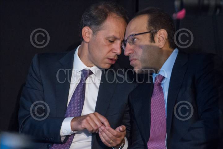 CIUDAD DE MÉXICO, 12SEPTIEMBRE2017.- Daniel Hajj Aboumrad, director de América Móvil, y Marco Antonio, director de Grupo Financiero Inbursa, durante la conferencia por el quinto aniversario de aplicación Transfer. FOTO: ISAAC ESQUIVEL /CUARTOSCURO.COM