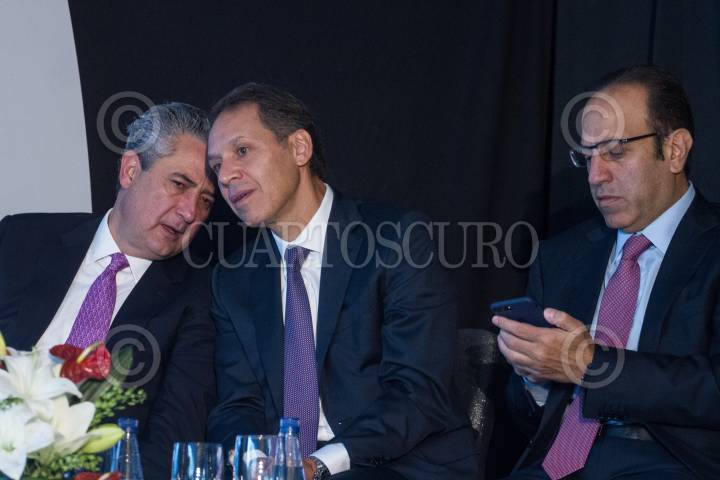 CIUDAD DE MÉXICO, 12SEPTIEMBRE2017.- Ernesto Torres Cantú, director general de Citibanamex, Daniel Hajj Aboumrad, director de América Móvil, y Marco Antonio, director de Grupo Financiero Inbursa, durante la conferencia por el quinto aniversario de aplicación Transfer. FOTO: ISAAC ESQUIVEL /CUARTOSCURO.COM