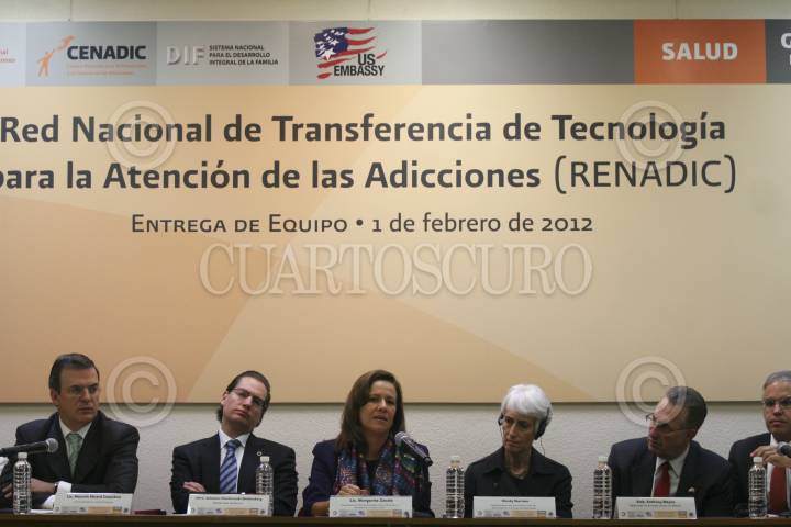 MÉXICO, D.F., 01FEBRERO2012.- Marcelo Ebrard, jefe de gobierno del D.F.; Salomón Chertorivski Woldenberg, Secretario de Salud; Margarita Zavala, presidenta del DIF; Wendy Sherman, subsecretaria de asuntos políticos del Departamento de Estado de los Estados Unidos; y Anthony Wayne, embajador de Estado Unidos en México; acudieron a la entrega del equipo que conforma la "Red Nacional de Transferencia de Tecnología para la Atención de las Adicciones" en el Centro Nueva Vida México-España. FOTO: IVÁN STEPHENS/CUARTOSCURO.COM
