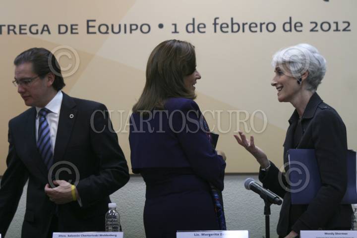 MÉXICO, D.F., 01FEBRERO2012.- Salomón Chertorivski Woldenberg, Secretario de Salud; Margarita Zavala, presidenta del DIF; y Wendy Sherman, subsecretaria de asuntos políticos del Departamento de Estado de los Estados Unidos; acudieron a la entrega del equipo que conforma la "Red Nacional de Transferencia de Tecnología para la Atención de las Adicciones" en el Centro Nueva Vida México-España. FOTO: IVÁN STEPHENS/CUARTOSCURO.COM