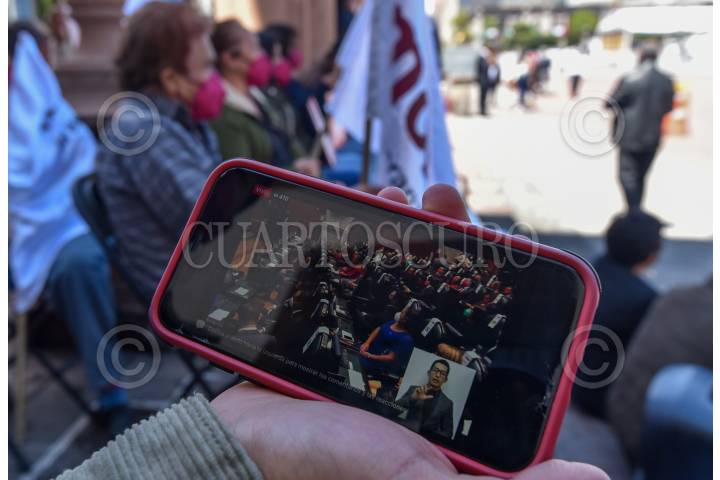 Acompañantes de Diputados integrantes de la LXI Legislatura local que no pudieron accesar a la Cámara de Diputados del Estado de México a la toma de protesta, siguieron la transmisión de la sesión en celulares.