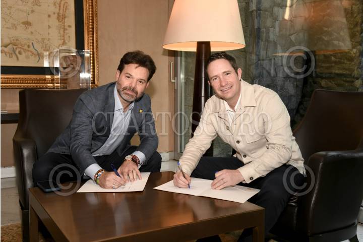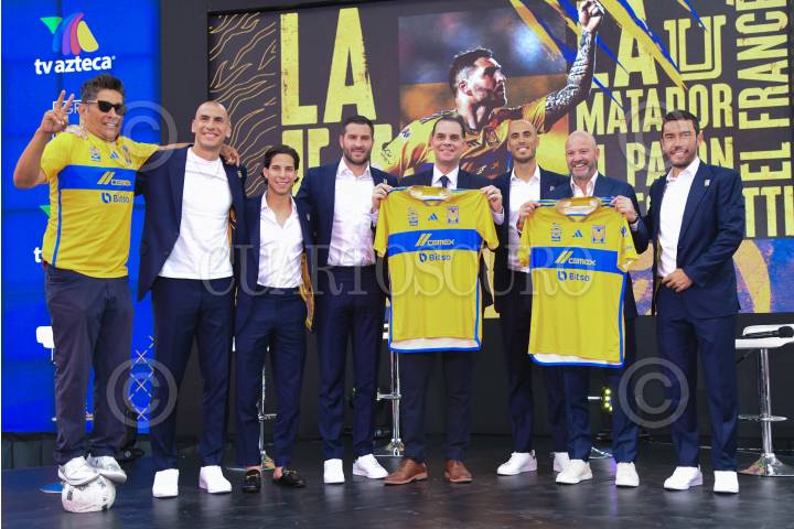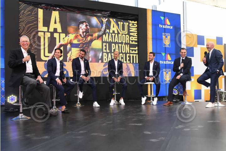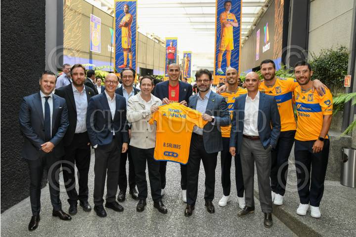 CIUDAD DE MÉXICO, 06JUNIO2024.- Con la presencia de Ricardo Salinas Pliego, Christian Martinoli y Luis García se realizó la firma con el Club Tigres para que sus juegos sean transmitidos por TV Azteca. Por parte del club regio asistieron Diego Laynez, André-Pierre Gignac y Juan Pablo Vigón. FOTO: TV AZTECA/CUARTOSCURO.COM