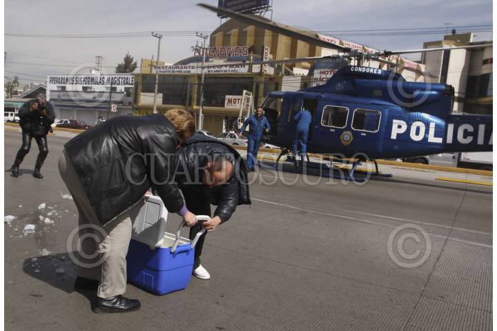 MÉXICO, D.F., 11ENERO2012.- Un corazón que fue trasladado en un helicóptero del grupo Cóndores de la SSPDF a el Hospital la Raza, cayo cuando el contenedor en el que lo transportaban se volteó por una mala maniobra, el órgano vital quedo regado sobre la calzada Vallejo en la delegación Azcapotzalco. Hace unos minutos el doctor Jaime Zaldivar Cervera, director del Hospital General del Centro Médico la Raza, confirmo que el corazón comenzó a ser implantado y que no sufrió ningún daño. FOTO: IVÁN MENDEZ/CUARTOSCURO.COM
