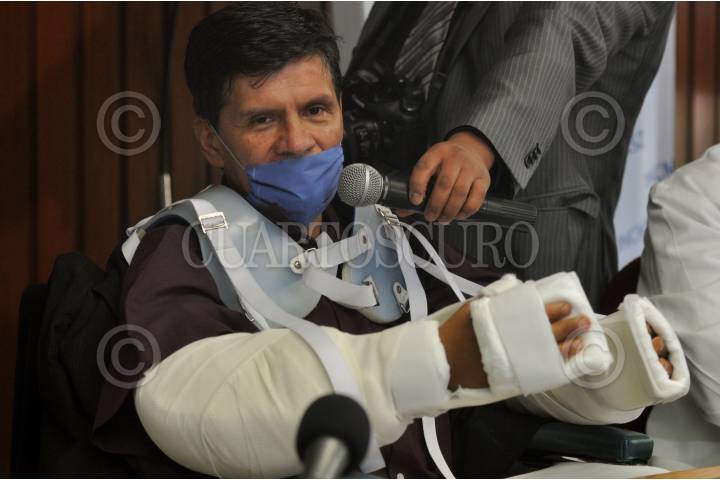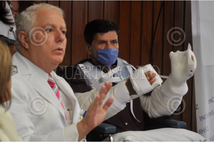 MÉXICO, D.F., 07JUNIO2012.- Gabriel Granados ofreció conferencia de prensa en el Instituto Nacional de Nutrición, donde dio a conocer el éxito en la operación donde se le transplantaron ambos brazos. Este es el primer transplante de extremidades en América Latina. Le acompañaron Fernando Gabilondo, director del Instituto, y el doctor Martin Iglesias. FOTO: EDUARDO MORALES /CUARTOSCURO.COM