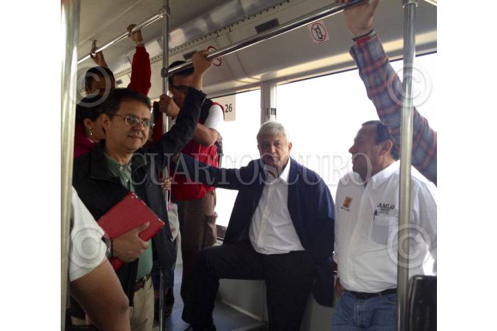 MÉXICO, D.F., 22JUNIO2012.- Andrés Manuel López Obrador, se transporta en el camión al interior del Aeropuerto para tomar el avión que lo trasladará la ciudad de Acapulco. FOTO: ELEAZAR GOMEZ /CUARTOSCURO.COM
