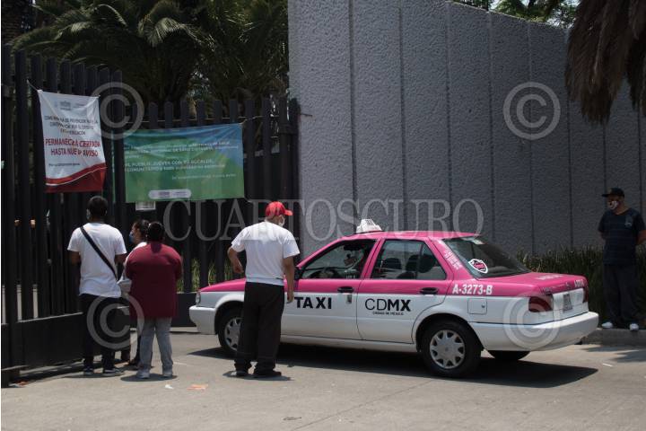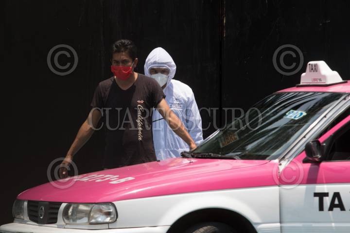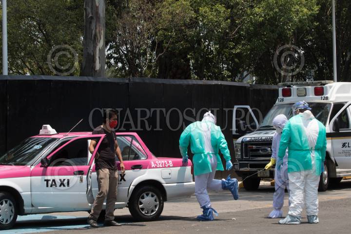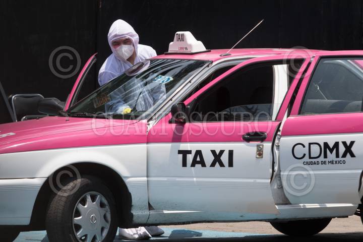 Un paramédico sanitiza un taxi que traslado a una mujer enferma al Hospital de Expansión para pacientes de Covid-19