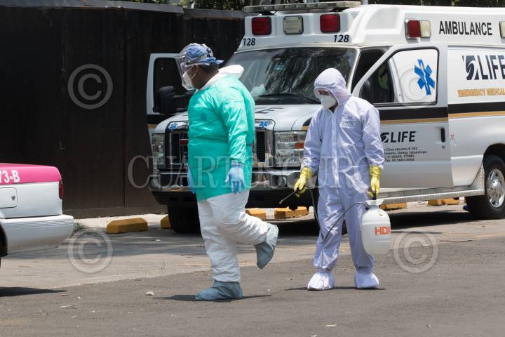 Paramédicos se desinfectan tras atender a una mujer que llegó enferma