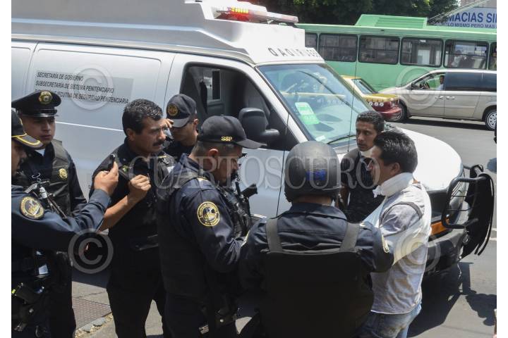 MÉXICO, D.F., 22ABRIL2014.- Una camioneta de traslado de reos choco contra un auto dejando dos heridos en la calle de doctor liciaga y eje central en la colonia Doctores donde la camioneta de reos se dio a la fuga y fue alcanzada hasta eje central y flores Magón, siendo llevada al lugar de los hechos para que respondiera por los daños asi como el traslado del reo que llevaban al reclusorio norte para una diligencia. FOTO: LUIS CARBAYO /CUARTOSCURO.COM