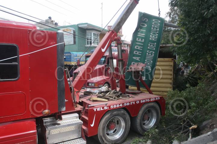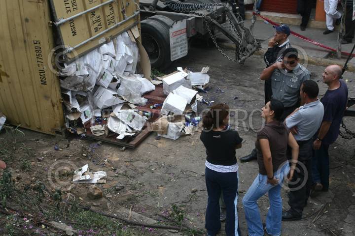 MEXICO, D.F., 17AGOSTO2009.- Un contenedor de un trailer que trasportaba botellas de vino blanco, volcó sobre la lateral de la avenida Jesús Reyes Heroles al cruce con la avenida Santa Cecilia en el municipio de Tlanepantla. Más de 4 horas se tardaron para remover dicho contenedor. FOTO: SAÚL LÓPEZ/CUARTOSCURO.COM