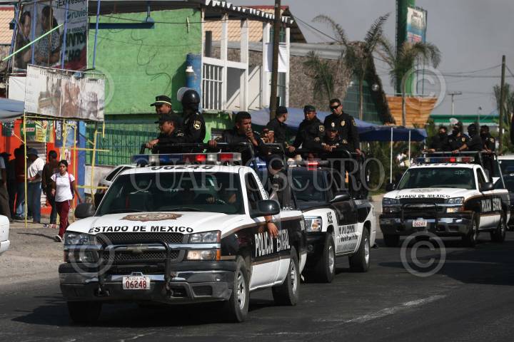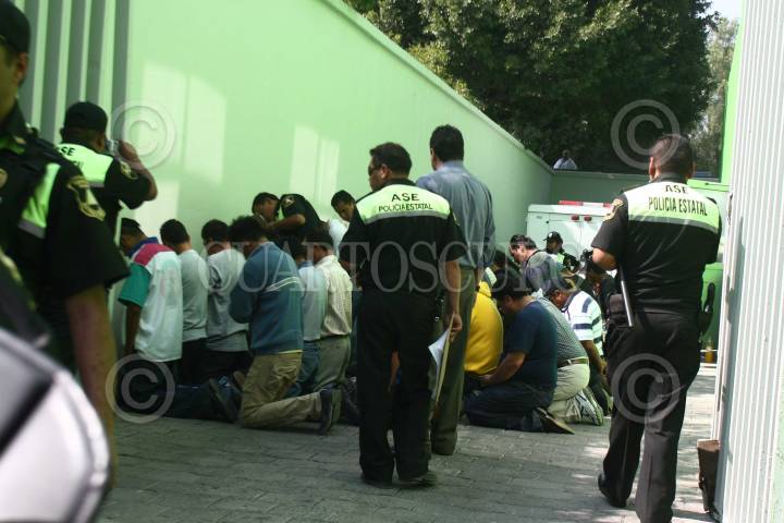ECATEPEC, ESTADO DE MÉXICO, 19NOVIEMBRE2009.- Más de 240 detenidos fueron llevados al Ministerio Publico de Ecatepec, entre ellos personas de la tercera edad y mujeres después de un zafarrancho en siete puntos de municipio y Tecamac, debido a la disputa de de agrupaciones transportistas estatales. En el Ministerio Publico agentes de la Agencia de Seguridad Estatal, policía municipal y judicial, hincaron a los detenidos en la explanada del centro de justicia y les engraparon en la ropa números de identificación. FOTO: SAÚL LÓPEZ/CUARTOSCURO.COM