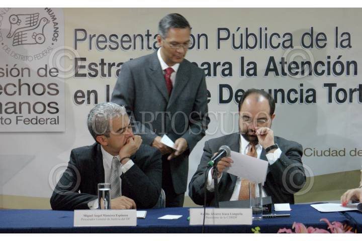 MÉXICO, D.F., 16FEBRERO2009.- Miguel Angel Mancera, procurador capitalino y Emilio Alvarez Icaza, en la presentación pública de la ¨Politica, a trevés de la cual se implementara la estrategia para la atención de casos de tortura en los que se denuncia tortura en la Comisión de Derechos Humanos del D.F. FOTO: VICTORIA VALTIERRA/CUARTOSCURO.COM