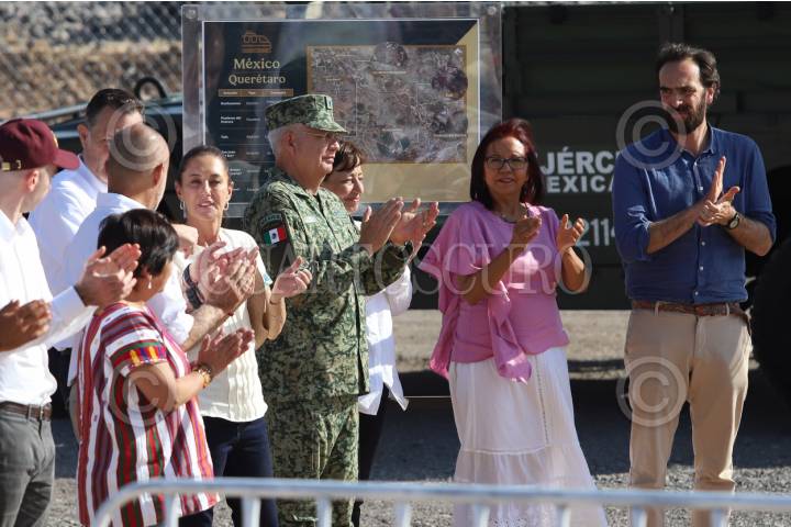 PEDRO ESCOBEDO, QUERÉTARO, 27ABRIL2025.- Claudia Sheinbaum, presidenta de México, acompañada del secretario de Defensa, Ricardo Trevilla Trejo y del titular de la Agencia Reguladora dr Transporte Ferroviario, Andrés Lajous, dio por iniciados los trabajos para la construcción del Tren México-Querétaro. FOTO: DANIEL AUGUSTO/ CUARTOSCURO.COM