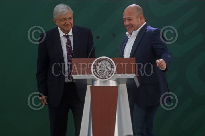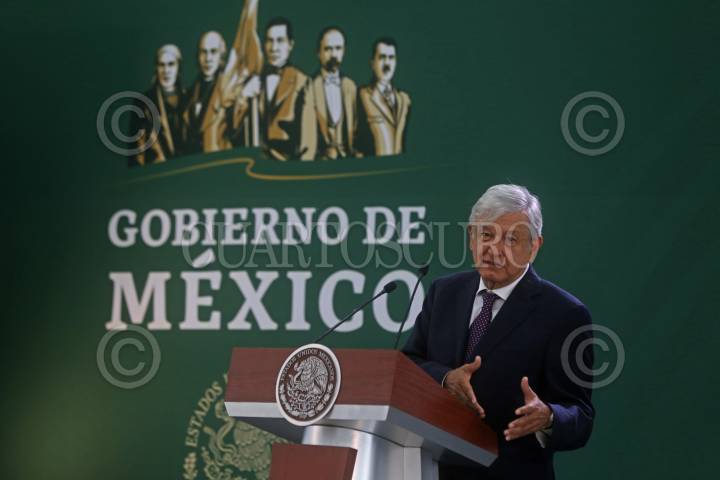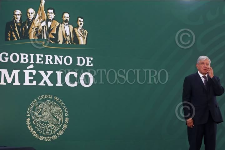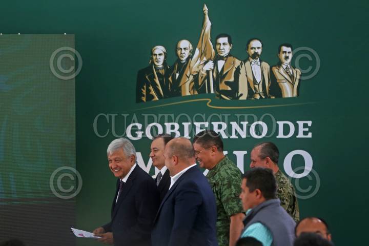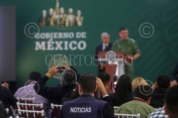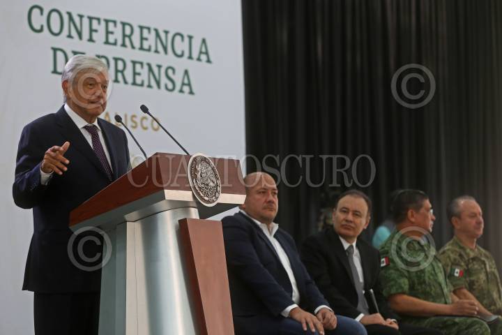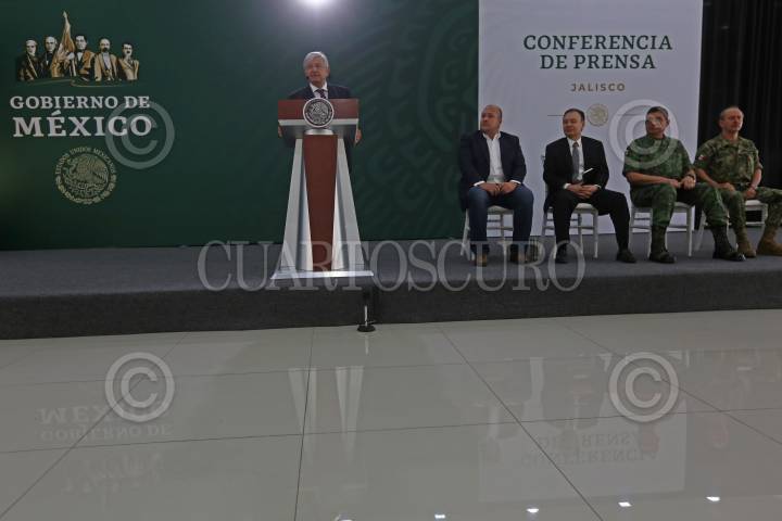 ZAPOPAN, JALISCO, 05ABRIL2019.- Andrés Manuel López Obrador Presidente de la Republica en compañía de Alfonso Durazo Secretario de Seguridad Publica de la Federación, Enrique Alfaro Ramírez Gobernador del estado de Jalisco y autoridades militares, encabezaron una conferencia de prensa matutina para hablar sobre la reunión de seguridad previa, las obras de la línea 3 del Tren Eléctrico Urbano entre otros, dicho compromiso se llevo a cabo el as Instalaciones del Colegio del Aire de la Base Aérea en la Quinta Región Militar. FOTO: FERNANDO CARRANZA GARCIA / CUARTOSCURO.COM