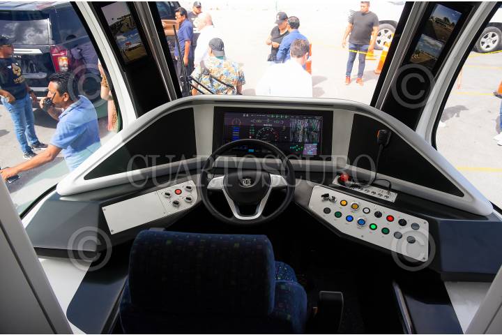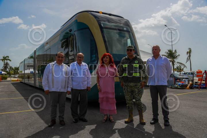 CAMPECHE, CAMPECHE, 30JULIO2024.- La gobernadora de Campeche, Layda Sansores San Román, acompañada por Miguel Ángel Gallardo López, titular de la Secretaría de Modernización Administrativa e Innovación Gubernamental, Bernhard Rehn, encargado del despacho de la Secretaría de Obras Publicas y Romeo Ruiz Armento, embajador de México en Guatemala, presentaron el primer prototipo del Tren Ligero. Este tren conectara el centro histórico de la ciudad y otros 13 puntos de la capital con la estación del tren maya ubicado en el periférico Pablo García. FOTO: MICHAEL BALAM/CUARTOSCURO.COM