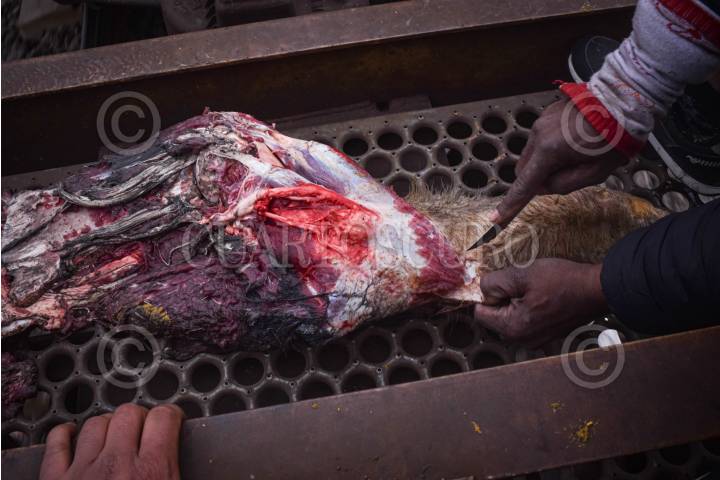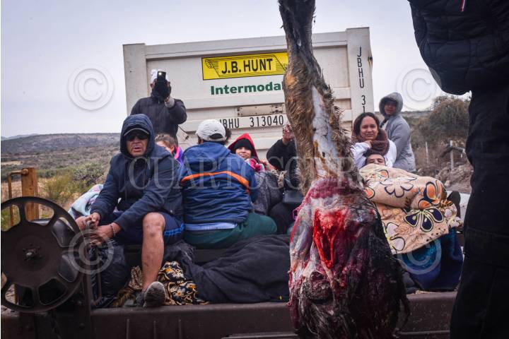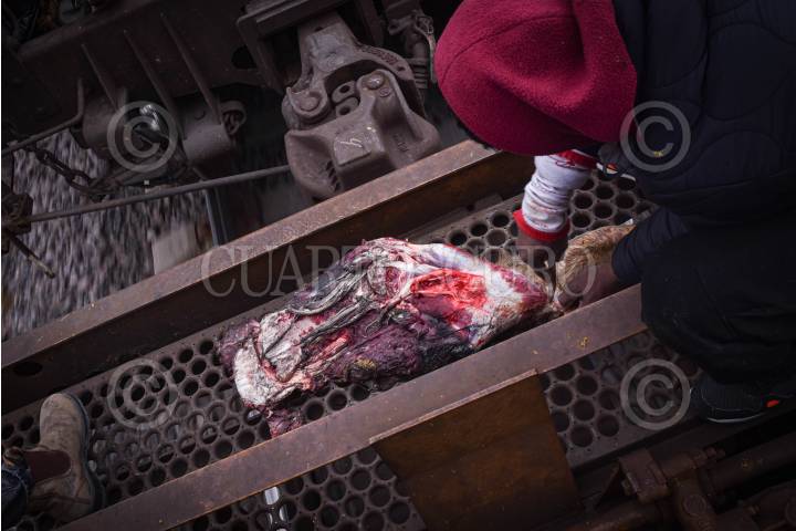 ENCARNACIÓN DE DÍAZ, JALISCO, 09ENERO2024.- Un grupo de aproximadamente 60 migrantes, en su mayoría venezolanos, abordan el tren de carga conocido como "La Bestia", en su camino al norte del continente. Durante el trayecto, en los límites entre Jalisco y Aguascalientes, el tren atropelló a una vaca que atravesaba las vías, una de sus patas quedó atorada entre dos vagones y fue rescatada por un puñado de migrantes, esperando poder cocinarla más adelante en su camino. FOTO: PEDRO ANZA /CUARTOSCURO.COM