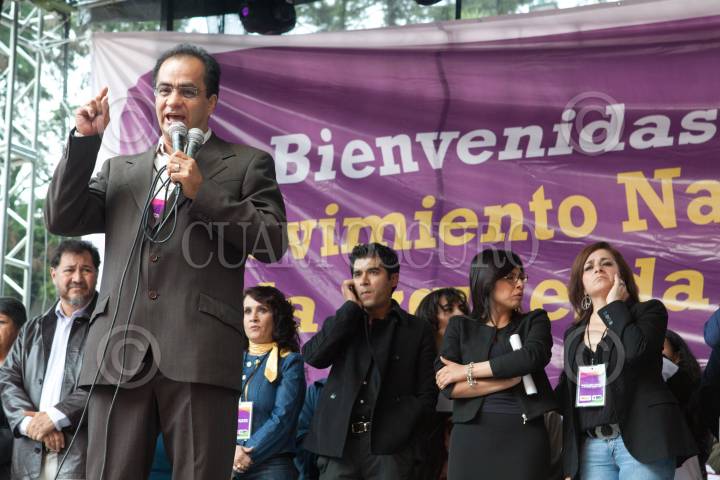 MÉXICO, D.F., 30JULIO2011.- Rene Bejarano, líder del Movimiento Nacional por la Esperanza, ofreció una discurso en un mitin a favor de las aspiraciones electorales de la diputada federal Leticia Quezada, quien se ha postulado como candidata a jefa delegacional de la Magdalena Contreras por la corriente perredista Izquierda Democrática Nacional, en la Plaza Cívica de la Unidad Independencia de la mencionada demarcación. Al fondo de la imagen Gerardo Fernández Noroña, diputado federal, Dolores Padierna, secretaria general del PRD, Leticia Quezada, diputada federal y Laura Velázquez, Secretaría de Desarrollo Económico del GDF. FOTO: MOISÉS PABLO/CUARTOSCURO.COM