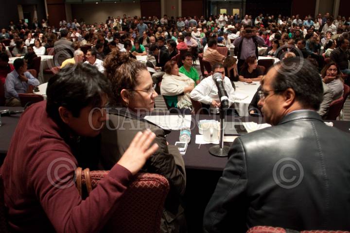 MÉXICO, D.F., 31AGOSTO2013.- Rene Bejarano líder de la corriente perredista Izquierda Democrática Nacional presidió su reunión nacional en un hotel de avenida Juárez. En la imagen el llamado "profesor" conversa con los delegados Alejandro Fernández, Cuauhtémoc y Marisela Contreras, Tlalpan. FOTO: MOISÉS PABLO /CUARTOSCURO.COM
