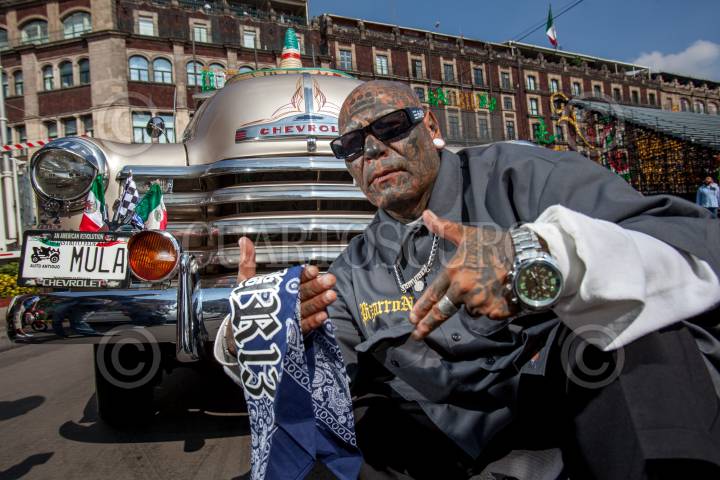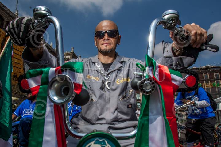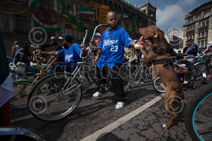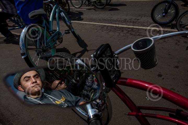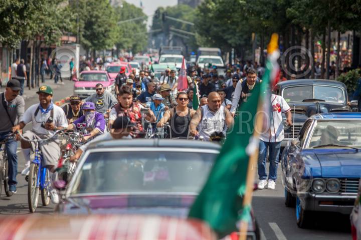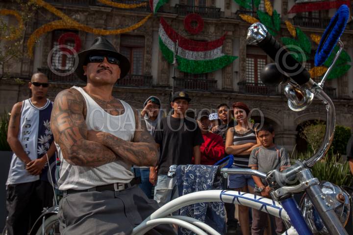 CIUDAD DE MÉXICO, 09SEPTIEMBRE2018.- Ciclistas y automotores del grupo "Chilangos Lowbike" realizaron una rodada del zócalo a la avenida Reforma, para dar a conocer el movimiento "Low Rider" en el área metropolitana. Sus miembros proceden de diversas colonias del Estado de México y la CDMX. La cultura Low Rider fue una forma de manifestación de la cultura chicana (cultura mexicana-estadounidense) que poco a poco fue permeando en la cultura afroamericana y otras en general, en la cual se modificaban coches clásicos y bicicletas, como una forma de vivir y manifestarse ante la sociedad. FOTO: JUAN PABLO ZAMORA /CUARTOSCURO.COM