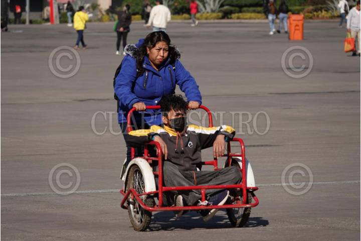 CIUDAD DE MÉXICO, 27ENERO2025.- Una mujer transporta en un triciclo a un joven en la plancha del Zócalo. FOTO: GRACIELA LÓPEZ/CUARTOSCURO.COM